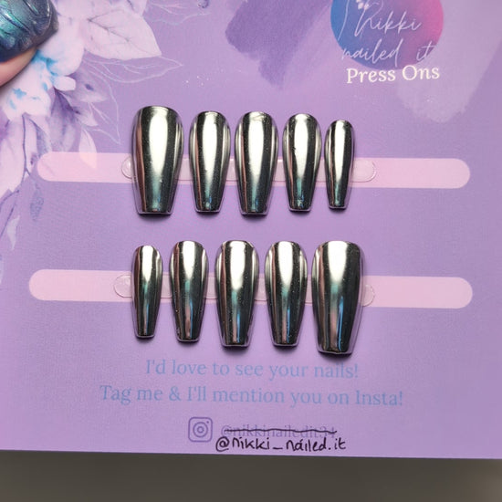 Upgrade your nail game with these hand painted silver chrome press on nails – a striking short press on coffin set featuring reflective chrome silver nails. Perfect as Halloween nails 2025 or cozy fall nails, these press on nails give you salon-quality artistry with a bold, eye-catching twist.