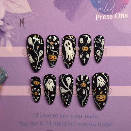 - Design: Hand painted monochrome ghosts and pumpkins, bringing classy and spooky together in these Halloween nails